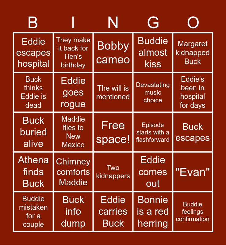 This bingo card has a free space and 75 words: Buck/Eddie kills someone, Buddie sunset reunion, Bobby cameo, Buck gets drugged, Bonnie is the kidnapper, Buddie motel scene, Buddie kiss, 2x13 Maddie parallels, Kidnapper thinks Buck is their son, Buck dies, Eddie hot wires/steals a car, Chris threatened, The will is mentioned, Buck thinks Eddie is dead, Maddie cries, Maddie flies to New Mexico, "What I Like About You" caraoke, Buddie feelings confirmation, Bonnie & Clyde, Margaret kidnapped Buck, Bobby alive, Buck buried alive, Eddie goes rogue, They make it back for Hen's birthday, Buddie almost kiss, Buck & Eddie fight pre-crash, Buck tortured, 2 part episode, Road trip montage, Someone comments on Bucks white shirt being unlucky, Eddie cries, Buck hallucinates, There's only one bed, Eddie comes out, Eddie's been in hospital for days, Devastating music choice, Russian roulette, Someone gets shot, Buck escapes, Bonnie is a red herring, Worried Chris, Eddie calls Buck "baby", Eddie beats up Bucks kidnapper, Eddie suspicious of Bonnie, Buck plays along for kidnapper, Maddie/Eddie interaction, Buddie mistaken for a couple, Eddie escapes hospital, Eddie finds out about Buck & Tommy hooking up, Buddie hug, Buck has psychotic break, Two kidnappers, Eddie moving to Texas is brought up, Abigail's dad is the kidnapper, Buck thinks Eddie's a hallucination, Creepy kidnapper, Amazing cinema-tography, Eddie wakes up in fake hospital, Maddie pregnant again, Amnesia, Chimney comforts Maddie, Buck anxious about Hen's b-day, Kidnapper returns Buck after he talks about Eddie, "D.I.Y." promo reveals nothing, Buck gives up, Episode starts with a flashforward, Serial killer, Another crossover, Aliens, "Evan", Athena finds Buck, Buck info dump, Coma dream, Eddie carries Buck and Crazy plot twist.