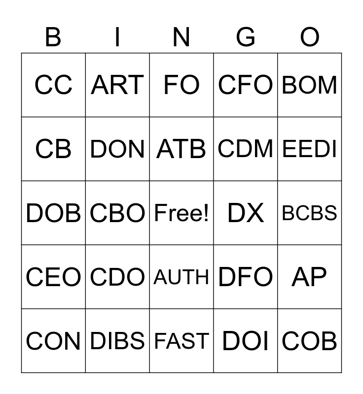 This bingo card has a free space and 65 words: ADJ, ALM, AMA, AP, APL, AR, ART, ASC, ATB, ATOS, AUTH, BAR, BCBS, BOM, CA, CB, CBO, CC, CDHP, CDM, CDO, CEO, CFO, CIF, CLT, CM, CMS, CMS 1500, COB, COINS, CON, CPT, CX, DED, DFO, DIBS, DO, DOB, DOI, DOL, DON, DOS, DX, EBITDA, ECS, EDI, EEDI, EFT, EOB, EOR, EPO, ERA, ERISA, FAST, FC, FFS, FMLA, FO, G/L, GVP, HCPCS, HIPAA, HMO, HR and HST.
