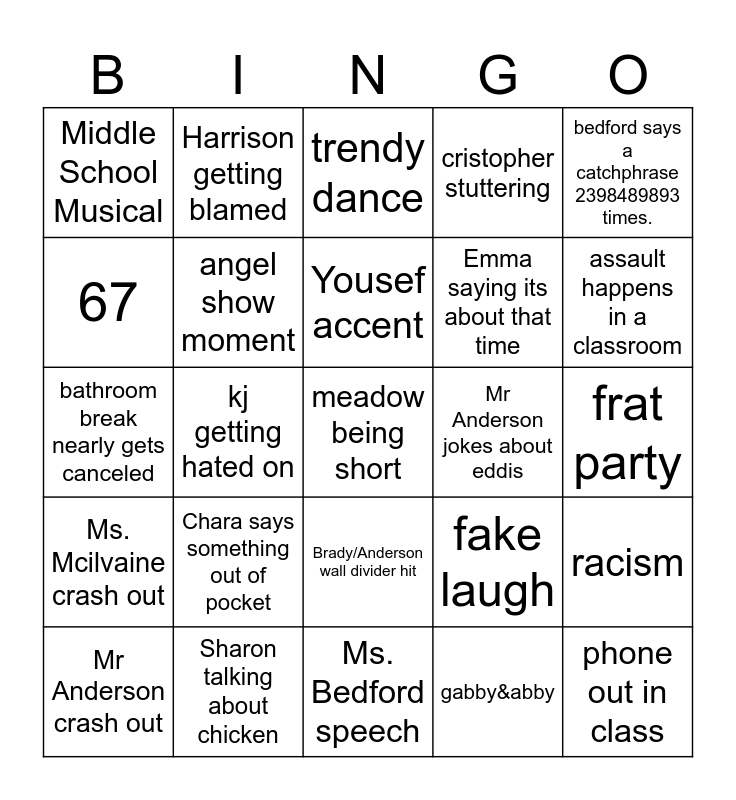 This bingo card has a free space and 24 words: Chara says something out of pocket, Sharon talking about chicken, Yousef accent, Mr Anderson crash out, bedford says a catchphrase 2398489893 times., Middle School Musical, 67, Harrison getting blamed, Mr Anderson jokes about eddis, Brady/Anderson wall divider hit, Emma saying its about that time, bathroom break nearly gets canceled, fake laugh, racism, angel show moment, gabby&abby, frat party, trendy dance, assault happens in a classroom, kj getting hated on, phone out in class, Ms. Mcilvaine crash out, cristopher stuttering and Ms. Bedford speech.
