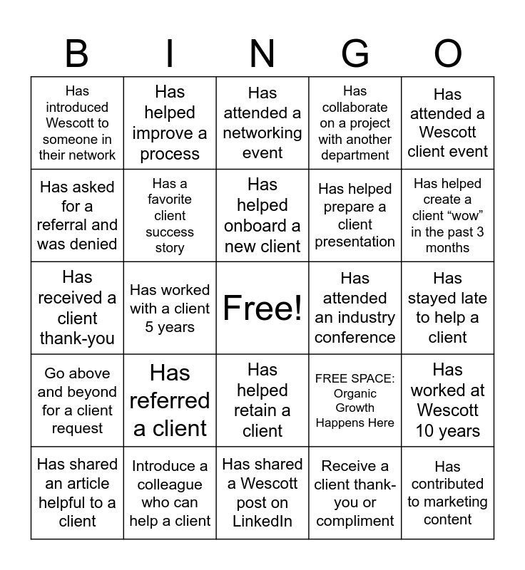 This bingo card has a free space and 25 words: Has referred a client, Has shared a Wescott post on LinkedIn, Has helped onboard a new client, Has shared an article helpful to a client, Has attended a Wescott client event, Has introduced Wescott to someone in their network, Has asked for a referral and was denied, Has helped improve a process, Has attended an industry conference, Has helped retain a client, Has helped prepare a client presentation, Has received a client thank-you, FREE SPACE: Organic Growth Happens Here, Has worked at Wescott 10 years, Has a favorite client success story, Has connected added a CPA or attorney to our referral list, Has stayed late to help a client, Has attended a networking event, Has helped create a client “wow” in the past 3 months, Has worked with a client 5 years, Has contributed to marketing content, Introduce a colleague who can help a client, Go above and beyond for a client request, Has collaborate on a project with another department and Receive a client thank-you or compliment.
