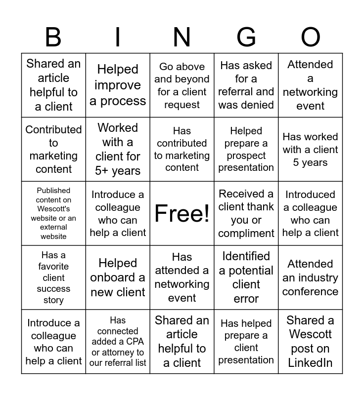 This bingo card has a free space and 115 words: Has referred a client, Has shared a Wescott post on LinkedIn, Has helped onboard a new client, Has shared an article helpful to a client, Has attended a Wescott client event, Has introduced Wescott to someone in their network, Has asked for a referral and was denied, Has helped improve a process, Has attended an industry conference, Has helped retain a client, Has helped prepare a client presentation, Has received a client thank-you, Has worked at Wescott 10 years, Has a favorite client success story, Has connected added a CPA or attorney to our referral list, Has stayed late to help a client, Has attended a networking event, Has helped create a client “wow” in the past 3 months, Has worked with a client 5 years, Has contributed to marketing content, Introduce a colleague who can help a client, Go above and beyond for a client request, Has collaborate on a project with another department, Receive a client thank-you or compliment, Has received a client thank-you, Has a favorite client success story, Has connected added a CPA or attorney to our referral list, Has stayed late to help a client, Has attended a networking event, Has helped create a client “wow” in the past 3 months, Has worked with a client 5 years, Has contributed to marketing content, Introduce a colleague who can help a client, Go above and beyond for a client request, Has collaborate on a project with another department, Receive a client thank-you or compliment, Has referred a client, Has shared a Wescott post on LinkedIn, Has helped onboard a new client, Has shared an article helpful to a client, Has attended a Wescott client event, Has introduced Wescott to someone in their network, Has asked for a referral and was denied, Has helped improve a process, Has attended an industry conference, Has helped retain a client, Has helped prepare a client presentation, Contributed to marketing content, Introduced a colleague who can help a client, Went above and beyond for a client request, Collaborated on a project with another department, Received a client thank you or compliment, Referred a client, Shared a Wescott post on LinkedIn, Helped onboard a new client, Shared an article helpful to a client, Attended a Wescott client event, Introduced Wescott to someone in their personal network, Asked for a referral and were denied, Helped improve a process, Attended an industry conference, Identified a potential client error, Helped prepare a prospect presentation, Added a CPA or attorney to our referral list, Stayed late to help a client, Attended a networking event, Helped create a client “wow” in the past 3 months, Worked with a client for 5+ years, Published content on Wescott's website or an external website, Contributed to marketing content, Introduced a colleague who can help a client, Went above and beyond for a client request, Collaborated on a project with another department, Received a client thank you or compliment, Referred a client, Shared a Wescott post on LinkedIn, Helped onboard a new client, Shared an article helpful to a client, Attended a Wescott client event, Introduced Wescott to someone in their personal network, Asked for a referral and were denied, Helped improve a process, Attended an industry conference, Identified a potential client error, Helped prepare a prospect presentation, Added a CPA or attorney to our referral list, Stayed late to help a client, Attended a networking event, Helped create a client “wow” in the past 3 months, Worked with a client for 5+ years, Published content on Wescott's website or an external website, Received a client thank you card, Added a CPA or attorney to our referral list, Stayed late to help a client, Attended a networking event, Created a client “wow” in the past 3 months, Worked with a client 5+ years, Contributed to marketing content, Introduced a colleague who can help a client, Went above and beyond for a new client request, Collaborated on a project with another department, Received a client thank-you letter, Conducted a discovery meeting from a prospect you sourced, Shared a Wescott post on LinkedIn, Posted your own post on LinkedIn for prospecting, Took a client to dinner or happy hour, Had meetings at a client’s home or office, Helped onboard a new client, Shared an article helpful to a client, Attended a Wescott client event, Introduced Wescott to someone in their network, Asked for a referral and were denied, Helped improve a process, Attended an industry conference and Helped prepare a prospect presentation.
