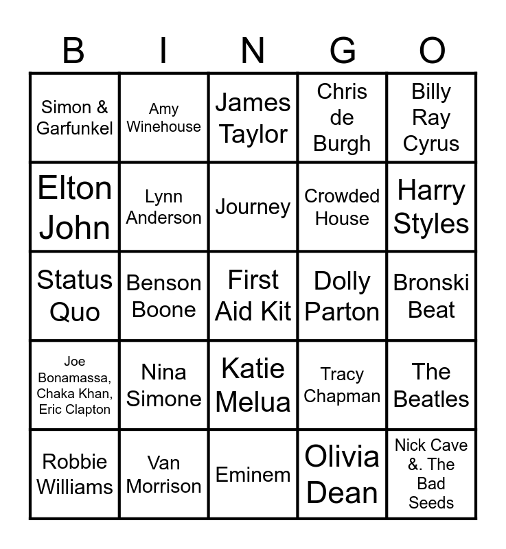 This bingo card has 25 words: Nina Simone, Eminem, Journey, Robbie Williams, Billy Ray Cyrus, Simon & Garfunkel, Elton John, Amy Winehouse, Dolly Parton, Katie Melua, Crowded House, Status Quo, Tracy Chapman, The Beatles, Lynn Anderson, Nick Cave &. The Bad Seeds, Bronski Beat, James Taylor, Harry Styles, Benson Boone, First Aid Kit, Van Morrison, Joe Bonamassa, Chaka Khan, Eric Clapton, Chris de Burgh and Olivia Dean.