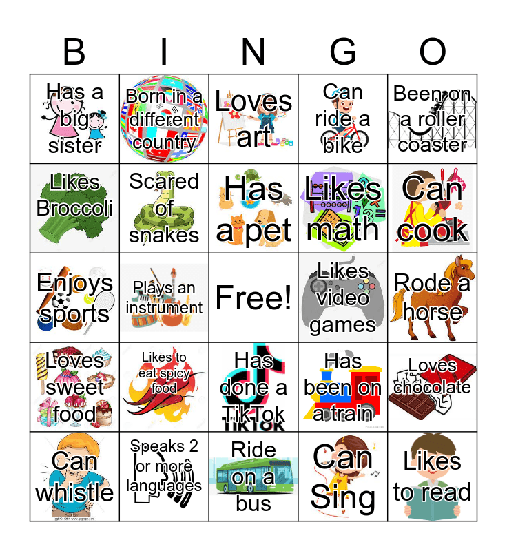 This bingo card has 24 images, a free space and 24 words: Likes to eat spicy food, Speaks 2 or more languages, Has a pet, Can whistle, Been on a roller coaster, Has a big sister, Likes Broccoli, Born in a different country, Likes video games, Has done a TikTok, Likes math, Enjoys sports, Has been on a train, Loves chocolate, Scared of snakes, Can Sing, Rode a horse, Loves art, Can cook, Plays an instrument, Likes to read, Loves sweet food, Can ride a bike and Ride on a bus.