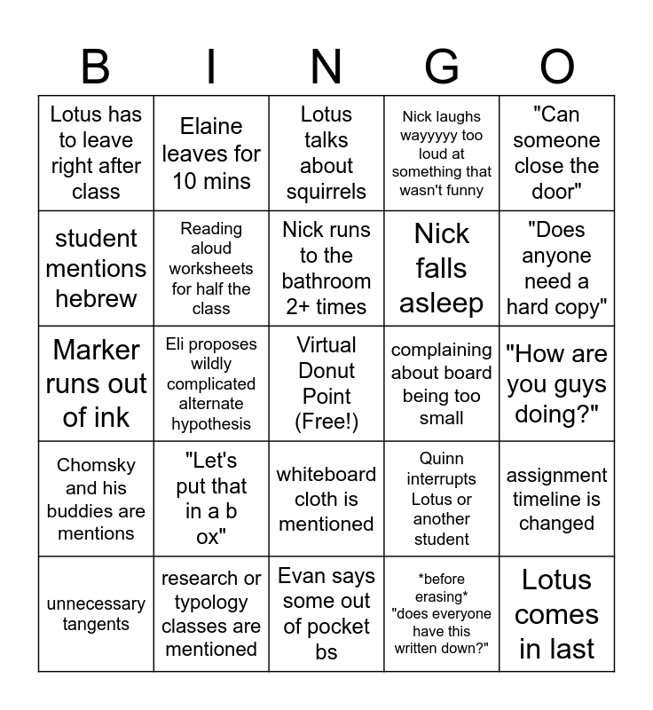 This bingo card has a free space and 24 words: "Let's put that in a box", research or typology classes are mentioned, Nick runs to the bathroom 2+ times, unnecessary tangents, "Can someone close the door", Lotus has to leave right after class, student mentions hebrew, Elaine leaves for 10 mins, complaining about board being too small, whiteboard cloth is mentioned, Nick falls asleep, Marker runs out of ink, Quinn interrupts Lotus or another student, assignment timeline is changed, Reading aloud worksheets for half the class, *before erasing* "does everyone have this written down?", "How are you guys doing?", Lotus talks about squirrels, "Does anyone need a hard copy", Eli proposes wildly complicated alternate hypothesis, Lotus comes in last, Chomsky and his buddies are mentions, Nick laughs wayyyyy too loud at something that wasn't funny and Evan says some out of pocket bs.