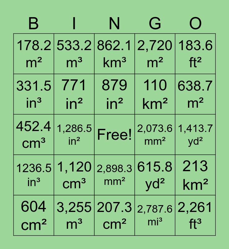 This bingo card has a free space and 29 words: 604 cm², 756 yd³, 1,286.5 in², 268.1 ft³, 178.2 m², 862.1 km³, 771 in², 1,120 cm³, 2,073.6 mm², 3,255 m³, 1,413.7 yd², 2,261 ft³, 207.3 cm², 2,787.6 mi³, 638.7 m², 279.5 km³, 2,898.3 mm², 1236.5 in³, 183.6 ft², 452.4 cm³, 615.8 yd², 142.4 m³, 110 km², 331.5 in³, 2,720 m², 533.2 m³, 213 km², 879 in² and 174.5 ft³.