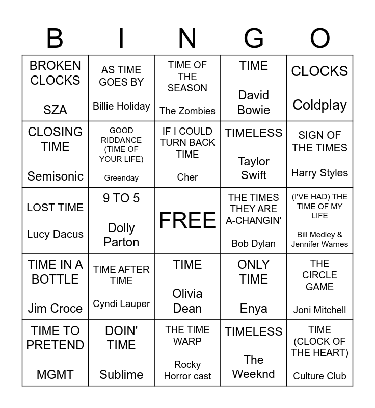 This bingo card has a free space and 25 words: TIME AFTER TIME Cyndi Lauper, THE TIME WARP Rocky Horror cast, IF I COULD TURN BACK TIME Cher, TIME TO PRETEND MGMT, CLOCKS Coldplay, BROKEN CLOCKS SZA, CLOSING TIME Semisonic, AS TIME GOES BY Billie Holiday, THE TIMES THEY ARE A-CHANGIN' Bob Dylan, TIME Olivia Dean, TIMELESS Taylor Swift, LOST TIME Lucy Dacus, ONLY TIME Enya, THE CIRCLE GAME Joni Mitchell, GOOD RIDDANCE (TIME OF YOUR LIFE) Greenday, SUMMER TIME DJ Jazzy Jeff and The Fresh Prince, (I'VE HAD) THE TIME OF MY LIFE Bill Medley & Jennifer Warnes, TIME OF THE SEASON The Zombies, SIGN OF THE TIMES Harry Styles, 9 TO 5 Dolly Parton, TIME (CLOCK OF THE HEART) Culture Club, DOIN' TIME Sublime, TIME IN A BOTTLE Jim Croce, TIME David Bowie and TIMELESS The Weeknd.