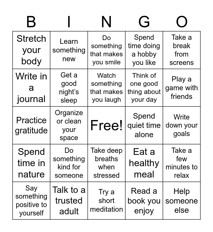 This bingo card has a free space and 35 words: Take a walk outside, Listen to music you enjoy, Talk to a friend about your feelings, Get a good night’s sleep, Take deep breaths when stressed, Spend time doing a hobby you like, Write in a journal, Drink water and stay hydrated, Watch something that makes you laugh, Spend time with family, Practice gratitude, Take a break from screens, Do something creative, Listen to calming or relaxing sounds, Stretch your body, Spend quiet time alone, Read a book you enjoy, Organize or clean your space, Spend time in nature, Help someone else, Eat a healthy meal, Say something positive to yourself, Take a few minutes to relax, Talk to a trusted adult, Do something that makes you smile, Play a game with friends, Dance or move around, Draw or doodle, Think of one good thing about your day, Write down your goals, Spend time with a pet, Try a short meditation, Do something kind for someone, Learn something new and Spend time away from noise and distractions.