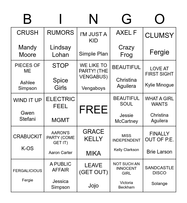 This bingo card has a free space and 27 words: MISS INDEPENDENT Kelly Clarkson, SO YESTERDAY Hilary Duff, BEAUTIFUL Christina Aguilera, LEAVE (GET OUT) Jojo, PIECES OF ME Ashlee Simpson, I'M JUST A KID Simple Plan, RUMORS Lindsay Lohan, CRABUCKIT K-OS, BEAUTIFUL SOUL Jessie McCartney, FINALLY OUT OF P.E. Brie Larson, WIND IT UP Gwen Stefani, AXEL F Crazy Frog, FERGALICIOUS Fergie, A PUBLIC AFFAIR Jessica Simpson, LOVE AT FIRST SIGHT Kylie Minogue, BRING IT ALL BACK S Club, STOP Spice Girls, WE LIKE TO PARTY! (THE VENGABUS) Vengaboys, AARON'S PARTY (COME GET IT) Aaron Carter, CRUSH Mandy Moore, WHAT A GIRL WANTS Christina Aguilera, NOT SUCH AN INNOCENT GIRL Victoria Beckham, ELECTRIC FEEL MGMT, SANDCASTLE DISCO Solange, GRACE KELLY MIKA, CLUMSY Fergie and STUCK Stacie Orrico.