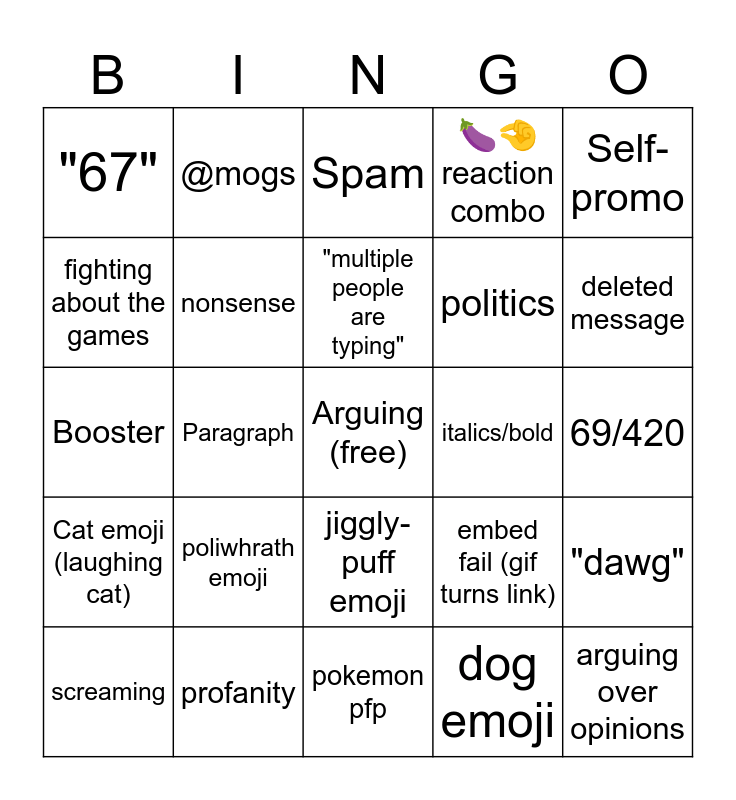 This bingo card has a free space and 44 words: "who is the best pokemon", arguing over opinions, all caps, screaming, @mods, dog emoji, Spam, Gif, Self-promo, profanity, 🍆🤏 reaction combo, italics/bold, jiggly-puff emoji, poliwhrath emoji, brainrot, pokemon pfp, PKMN tag, Booster, "???", deleted message, @mogs, fake @mods ping, muted/ warned/ banned, "67", "bro", 69/420, actual funny jokes, wrong channel, embed fail (gif turns link), Cat emoji (laughing cat), bets, "dawg", no colored role, Server Tag (any), Paragraph, obviously googled, silence (rare), agreeing (rare), "multiple people are typing", fighting about the games, politics, Rascism, nonsense and fighting about pokemon.