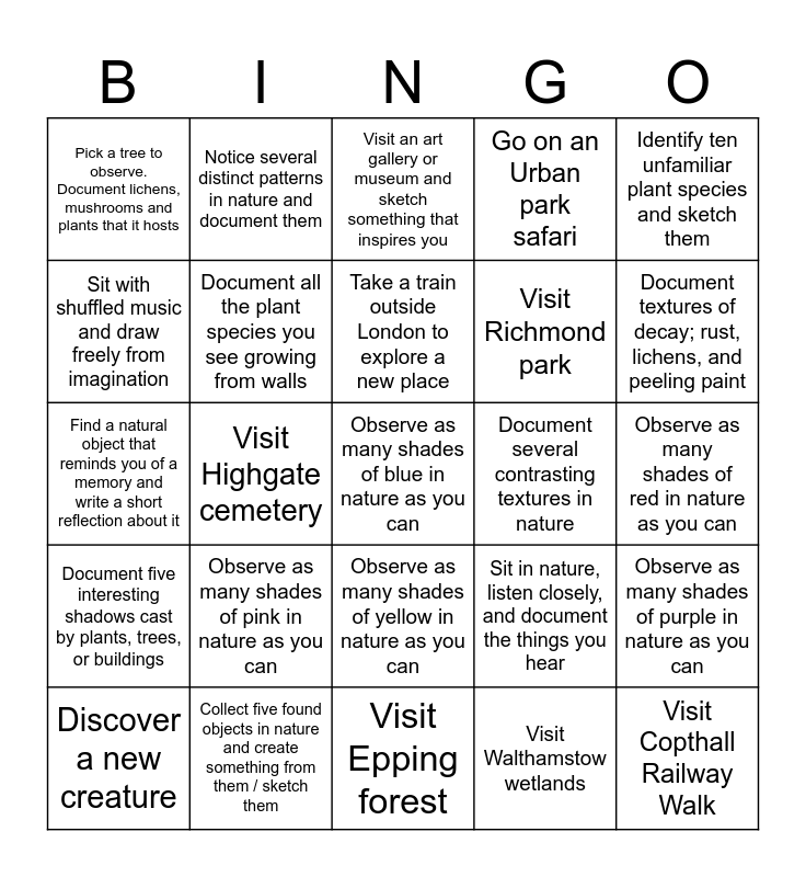 This bingo card has a free space and 24 words: Observe as many shades of pink in nature as you can, Collect five found objects in nature and create something from them / sketch them, Take a train outside London to explore a new place, Discover a new creature, Identify ten unfamiliar plant species and sketch them, Pick a tree to observe. Document lichens, mushrooms and plants that it hosts, Sit with shuffled music and draw freely from imagination, Notice several distinct patterns in nature and document them, Document several contrasting textures in nature, Observe as many shades of yellow in nature as you can, Visit Richmond park, Find a natural object that reminds you of a memory and write a short reflection about it, Sit in nature, listen closely, and document the things you hear, Observe as many shades of purple in nature as you can, Document all the plant species you see growing from walls, Visit Walthamstow wetlands, Observe as many shades of red in nature as you can, Visit an art gallery or museum and sketch something that inspires you, Document textures of decay; rust, lichens, and peeling paint, Visit Highgate cemetery, Visit Copthall Railway Walk, Document five interesting shadows cast by plants, trees, or buildings, Go on an Urban park safari and Visit Epping forest.