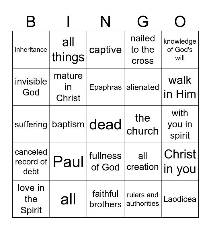 This bingo card has 25 words: Paul, faithful brothers, Epaphras, love in the Spirit, knowledge of God's will, inheritance, invisible God, all things, the church, fullness of God, alienated, suffering, all creation, Christ in you, mature in Christ, Laodicea, with you in spirit, captive, walk in Him, baptism, dead, all, canceled record of debt, nailed to the cross and rulers and authorities.
