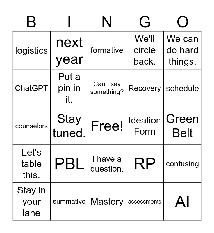 This bingo card has a free space and 39 words: Who's in charge of this?, Who wants to take point on this?, Put a plug in that., Put a pin in it., Stay in your lane, I have a question., Can I say something?, I don't understand., We can do hard things., Let's table this., Stay tuned., We'll circle back., AI, Green Belt, Ideation Form, PBL, Toddle, logistics, TBD, RP, ChatGPT, Mastery, Recovery, schedule, credits, WIN, snacks, pivot, later work, next year, data, scaffolding, formative, summative, assessments, self-care, confusing, counselors and DSDs.