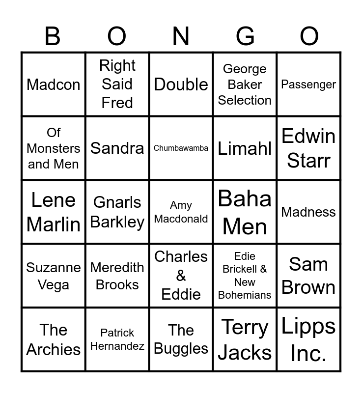 This bingo card has 25 words: Meredith Brooks, The Buggles, Chumbawamba, The Archies, Passenger, Madcon, Of Monsters and Men, Right Said Fred, Baha Men, Charles & Eddie, Limahl, Lene Marlin, Edie Brickell & New Bohemians, Sam Brown, Sandra, Lipps Inc., Madness, Double, Edwin Starr, Gnarls Barkley, Amy Macdonald, Patrick Hernandez, Suzanne Vega, George Baker Selection and Terry Jacks.