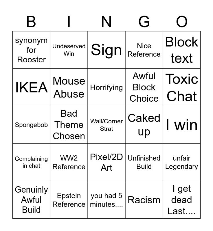 This bingo card has a free space and 24 words: WW2 Reference, Epstein Reference, Horrifying, Genuinly Awful Build, Block text, synonym for Rooster, IKEA, Undeserved Win, Caked up, Pixel/2D Art, Awful Block Choice, Spongebob, Unfinished Build, unfair Legendary, Mouse Abuse, Racism, I win, Sign, Toxic Chat, Bad Theme Chosen, I get dead Last...., Complaining in chat, Nice Reference and you had 5 minutes.....
