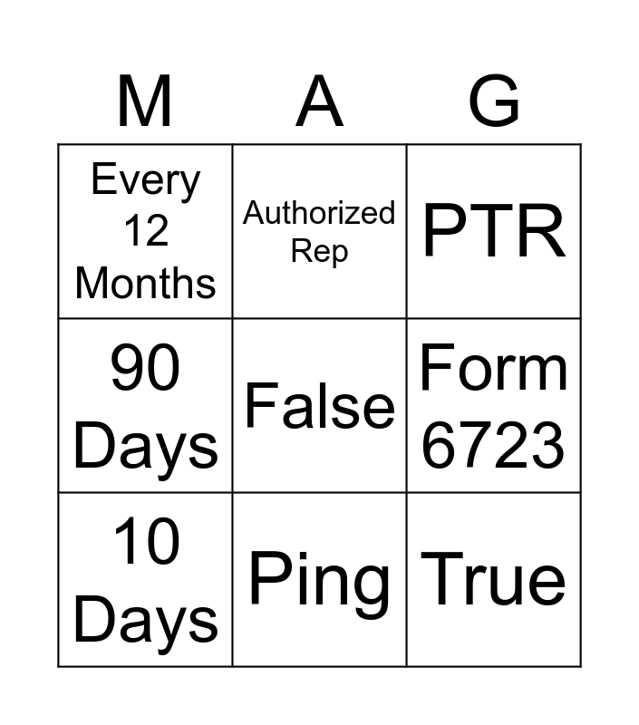 This bingo card has 14 words: Free!, Form 7216, 10 Days, Authorized Rep, 90 Days, False, True, 1st of the month, Ping, Every 12 Months, True, Form 6723, PTR and SSI Recipient.