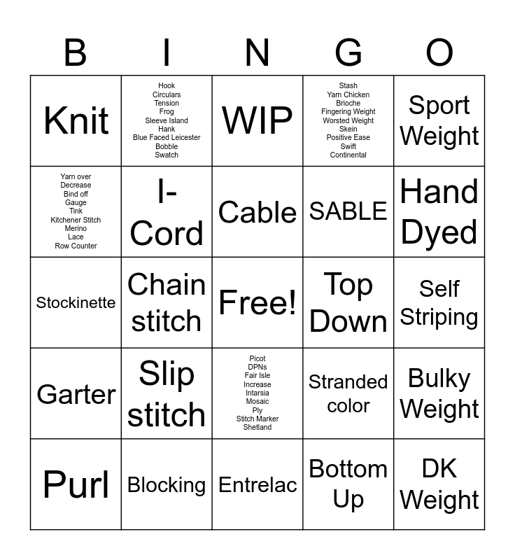 This bingo card has a free space and 29 words: Cast-on, Blocking, WIP, Ribbing, Sport Weight, Knit, I-Cord, Cable, Top Down, Bulky Weight, Purl, Chain stitch, Bottom Up, DK Weight, Stockinette, Double crochet, Entrelac, Stranded color, Hand Dyed, Garter, Slip stitch, Steek, SABLE, Self Striping, Yarn over Decrease Bind off Gauge Tink Kitchener Stitch Merino Lace Row Counter, Hook Circulars Tension Frog Sleeve Island Hank Blue Faced Leicester Bobble Swatch, Picot DPNs Fair Isle Increase Intarsia Mosaic Ply Stitch Marker Shetland, Stash Yarn Chicken Brioche Fingering Weight Worsted Weight Skein Positive Ease Swift Continental and Raglan Long tail Cast-on German Short Row Tunisian Crochet Crochet Superwash Rambouillet Ball Winder Portuguese.
