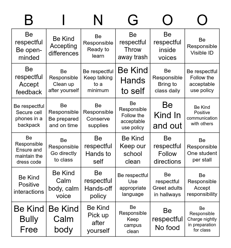 This bingo card has 55 words: Free!, Be respectful Hands to self, Be respectful Indoor voice, Be respectful Be open-minded, Be respectful Follow directions, Be respectful Follow the classroom rules, Be respectful Accept feedback, Be respectful Pick up after yourself, Be respectful Keep talking to a minimum, Be respectful Use during passing period, Be respectful Throw away trash, Be respectful No food, Be respectful Use appropriate language, Be respectful Hands-off policy, Be respectful Remove hoods, Be respectful Greet adults in hallways, Be respectful inside voices, Be respectful Follow the acceptable use policy, Be respectful Treat Chromebooks with care, Be respectful Secure cell phones in a backpack, Be Responsible Be prepared and on time, Be Responsible Accept responsibility, Be Responsible Ensure and maintain the dress code, Be Responsible Ready to learn, Be Responsible Charged chromebook, Be Responsible Clean up after yourself, Be Responsible One student per stall, Be Responsible Wash your hands, Be Responsible Conserve supplies, Be Responsible Go directly to class, Be Responsible Walk, Be Responsible Keep campus clean, Be Responsible One-way hallway, Be Responsible Walking feet, Be Responsible Visible ID, Be Responsible Bring to class daily, Be Responsible Charge nightly in preparation for class, Be Responsible Follow the acceptable use policy, Be Kind Positive interactions, Be Kind Bully Free, Be Kind Accepting differences, Be Kind encouragement with classmates, Be Kind Mistakes help me learn, Be Kind Positive Attitude = success, Be Kind In and out, Be Kind Keep our school clean, Be Kind Be helpful to others, Be Kind Pick up after yourself, Be Kind Calm body, calm voice, Be Kind Hands to self, Be Kind Calm body, Be Kind Hold Doors, Be Kind Hands on own computer, Be Kind Positive communication with others and via electronic devices.