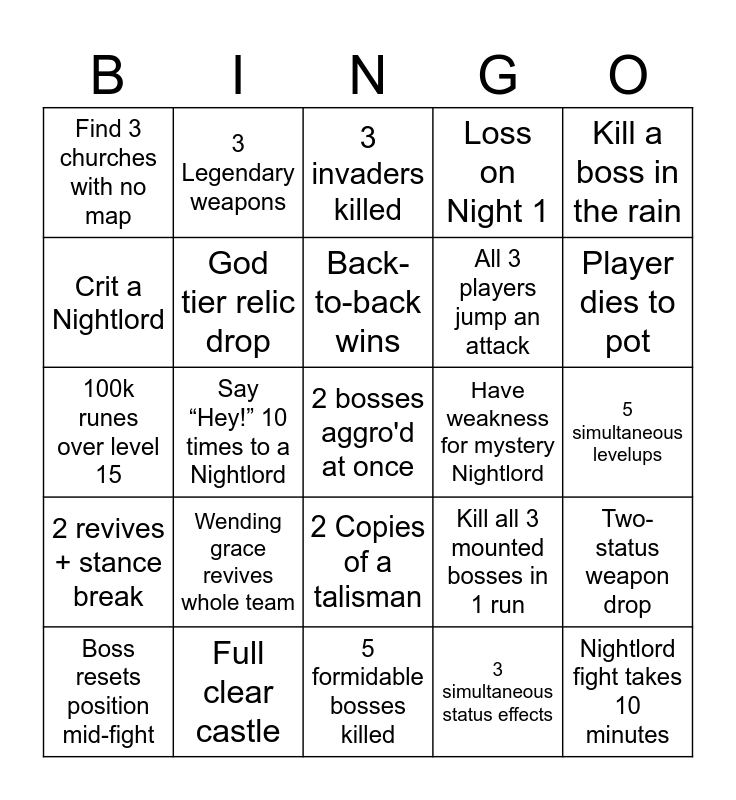 This bingo card has 38 words: Free!, Red Bell Bearing Hunter, All down, 5% boss health, God tier relic drop, Two-status weapon drop, Wending grace revives whole team, Back-to-back wins, Win below level 14, Kill a boss in the rain, All 3 players jump an attack, Say “Hey!” 10 times to a Nightlord, Loss on Night 1, 2 bosses aggro'd at once, 5 simultaneous levelups, Crit a Nightlord, 2 revives + stance break, Hit a Nightlord with a white weapon, 3 invaders killed, Clutch solo boss kill, Have weakness for mystery Nightlord, Find 3 churches with no map, Full clear castle, Player dies to pot, Boss resets position mid-fight, 4 crits on one enemy, 5 formidable bosses killed, Nightlord fight takes 10 minutes, Third guy ragequits, 3 weapons with matching passives, Rando has an insane build, 500 AR on a weapon, 2 Copies of a talisman, 3 simultaneous status effects, 3 Legendary weapons, All 3 players same character, Kill all 3 mounted bosses in 1 run, 100k runes over level 15 and Get 5 boss drops from a Shifting Earth.
