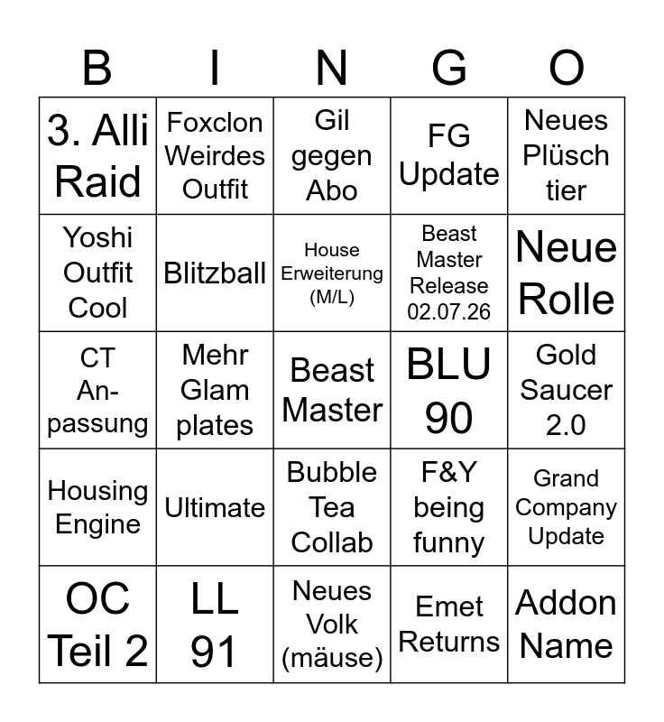 This bingo card has a free space and 24 words: Ultimate, LL 91, House Erweiterung (M/L), OC Teil 2, Neues Plüsch tier, 3. Alli Raid, Yoshi Outfit Cool, Foxclon Weirdes Outfit, BLU 90, Bubble Tea Collab, Beast Master Release 02.07.26, CT An-passung, F&Y being funny, Grand Company Update, Blitzball, Emet Returns, Gold Saucer 2.0, Gil gegen Abo, Neue Rolle, Mehr Glam plates, Addon Name, Housing Engine, FG Update and Neues Volk (mäuse).