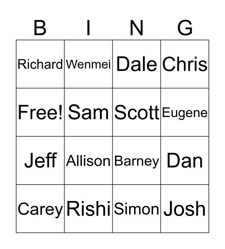 This bingo card has 16 words: Rishi, Dan, Dale, Richard, Jeff, Wenmei, Barney, Simon, Free!, Sam, Carey, Chris, Allison, Eugene, Scott and Josh.