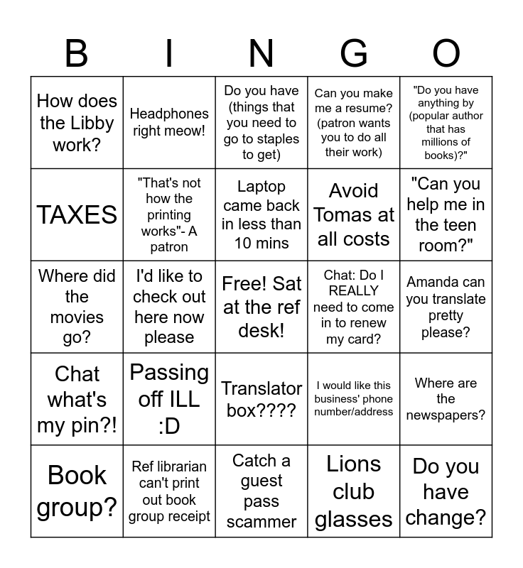 This bingo card has a free space and 39 words: Took a call from Andrew, Annoyed the Ref person with questions while they were busy, Printer has problems...., "That's not how the printing works"- A patron, Book group?, Translator box????, Laptop came back in less than 10 mins, "Do you have this book? It's (the wrong title)", "Do you have anything by (popular author that has millions of books)?", Chat what's my pin?!, I'd like to check out here now please, Can you make me a resume? (patron wants you to do all their work), Do you have change?, Amanda can you translate pretty please?, Chat: Do I REALLY need to come in to renew my card?, Passing off ILL :D, Evil shipping label print, How does the Libby work?, Can you fix my phone/tablet, I would like this business' phone number/address, TAXES, Catch a guest pass scammer, Avoid Tomas at all costs, "Can you help me in the teen room?", What? And ACTUAL Ref question??, "Where would I go if I wanted to learn how to do this thing?", So... I hear ya'll gots some free passes?, 0 interactions with customers, Hunt room (but not for research), Headphones right meow!, Do you guys have bathrooms?, I need a pen, Do you have (things that you need to go to staples to get), Ref librarian can't print out book group receipt, Lions club glasses, Do you have cups? (or any other non office supply thing), Where are the newspapers?, Where did the movies go? and I remember when you guys use to have a lot more books.