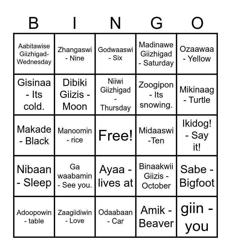 This bingo card has a free space and 95 words: Gashkadino Giizis- November, Nishwaaso -8, Amik -Beaver, Namebin - Sucker, Ishkwa Aname Giizis- Sunday, Naanan - five, Miigwech -Thank you, Zaagiidiwin - Love, Boozhoo - Hello, Niizho Giizhigat - Tuesday, Niizhwaaswi -Seven, Waabishkaa - White, Bezhig - One, Niiwi Giizhigad - Thursday, Niizh - Two, Aabitawise Giizhigad- Wednesday, Mikinaag - Turtle, Nibwaakaawin - Wisdom, Giingoo - Fish, Ma'iingan - Wolf, Miskwaa - Red, Migizi Giizis - February, Nika Giizis - March, Aabita Niibino Giizis - July, Madinawe Giizhigad - Saturday, Gisinaa - Its cold., Aabawaa - Its warm., Zoogipon - Its snowing., Gimiwan - Its raining., Biindigen - Come in, Ga waabamin - See you., Daga - please, Maajaan - Leave, Ishkwandem - door, Adoopowin - table, Desabiwin - Chair, Odaabaan - Car, Gakinaa awiya - Everyone, Makade - Black, Makwa - Bear, Sabe - Bigfoot, Manoomin - rice, Ayaa - lives at, Ozaawaa - Yellow, Binaakwii Giizis - October, Midaaswi -Ten, Dabasenimowin - Humility, Niswi - Three, Mashkode Bizhiki- Buffalo, Mooz - Moose, Ni Doodem - my clan is, Gwayakaadiziwin - Honesty, Manajiiwewin - Respect, Niiwin - Four, Gichi Manidoo Giizis - January, Ozhaawashkwaa - Blue, Green, Debwewin - Truth, Naano Giizhigad - Friday, Ishkwaa Anami'e Giizhigad - Monday, Giizis - Sun, Dibiki Giizis - Moon, Anang - Star, Ziigwan - Spring, Biboon - Winter, Niibin - Summer, Dagwaagin- Fall, Zaagibagwi Giizis - May, Bashkaawi Giizis - June, Godwaaswi - Six, Nimaamaa - my mom, Mbaabaa - my dad, wiijigikaan - husband/wife, giin - you, niin - me, wiin - him/her, wiinawaa - them, Omagakii Giizis - April, Waabagaa Giizis - September, Manidoo Giizisons - December, Zhangaswi - Nine, Ndizhinikaas - My name is, Nimino ayaa - I'm well., Migizi - Eagle, Binenshii - Bird, Ikidog! - Say it!, Nibaan - Sleep, Namadabin - Sit, Ojijaag - Crane, Wiijiiwaagan - Friend, Niibawi - He/she is standing, Nibi- Water, Ziibi - River, Saaga'igan - Lake, Aaniin - How are you? and Zoongidewewin - Courage.