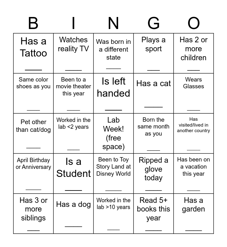 This bingo card has a free space and 24 words: Has 3 or more siblings ___, Is a Student ___, Is left handed ___, Read 5+ books this year ____, Has 2 or more children ___, Has a Tattoo ___, Watches reality TV ____, Was born in a different state ____, Born the same month as you ____, Has visited/lived in another country _____, Pet other than cat/dog ____, Been to a movie theater this year ____, Ripped a glove today ____, Has been on a vacation this year ____, Same color shoes as you ____, Has a dog ____, Worked in the lab >10 years ____, Plays a sport ___, Wears Glasses ____, April Birthday or Anniversary _____, Worked in the lab <2 years ____, Been to Toy Story Land at Disney World _____, Has a cat ____ and Has a garden ____.
