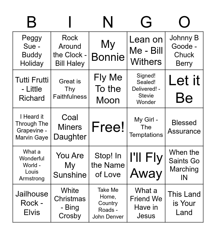 This bingo card has a free space and 24 words: You Are My Sunshine, White Christmas - Bing Crosby, Fly Me To the Moon, Jailhouse Rock - Elvis, Johnny B Goode - Chuck Berry, Peggy Sue - Buddy Holiday, Tutti Frutti - Little Richard, Rock Around the Clock - Bill Haley, My Girl - The Temptations, Stop! In the Name of Love, Signed! Sealed! Delivered! - Stevie Wonder, I Heard it Through The Grapevine - Marvin Gaye, I'll Fly Away, When the Saints Go Marching IN, Great is Thy Faithfulness, What a Friend We Have in Jesus, Blessed Assurance, My Bonnie, Let it Be, Coal Miners Daughter, This Land is Your Land, What a Wonderful World - Louis Armstrong, Lean on Me - Bill Withers and Take Me Home, Country Roads - John Denver.
