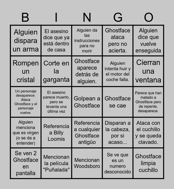 This bingo card has a free space and 44 words: Ghostface stalkea a alguien, Ghostface limpia cuchillo, Alguien tiene sexo, Se ven 2 Ghostface en pantalla, Ghostface llama al/la prota, Se ve que es un numero desconocido, Alguien da las instrucciones para no morir, Un susto que al final no es nada..., Alguien dice que vuelve enseguida, Mencionan la película ''Puñalada'', Ghostface ataca pero no acierta., Ghostface se cae, Referencia a cualquier Ghostface antigüo, Referencia a Billy Loomis, Sale Gale Wheaters, Mencionan Woodsboro, Alguien acusa al/la novi@ del prota, Un personaje desaparece. Ataca Ghostface y el personaje vuelve., Cierran una puerta, Cierran una ventana, El asesino dice que ya está dentro de casa, Aparece un ático, Aparece un sótano, Alguien dispara un arma, Disparan a Ghostface, Parece que han matado a Ghostface pero de repente, desaparece., Preguntan por la peli de miedo fav, Se ve sangre en el cuchillo., Disparan a la cabeza, por si acaso..., Alguien menciona que es virgen (o se da a entender), Pregunta si le gusta las pelis de miedo, Ataca con el cuchillo y se queda clavado., La policía intenta localizar la llamada y no llega a tiempo, Ghostface atraviesa una ventana, El asesino parece muerto, pero se levanta una última vez, Un plano donde la sangre salpica la pantalla., Mesa llena de alcohol/comida, Ghostface inclina la cabeza icónicamente., Ghostface aparece detrás de alguien., Rompen un cristal, Alguien intenta huir y el motor del coche falla., Insulto a Ghostface, Corte en la garganta and Alguien activa alarma de un coche para distraer o pedir ayuda.