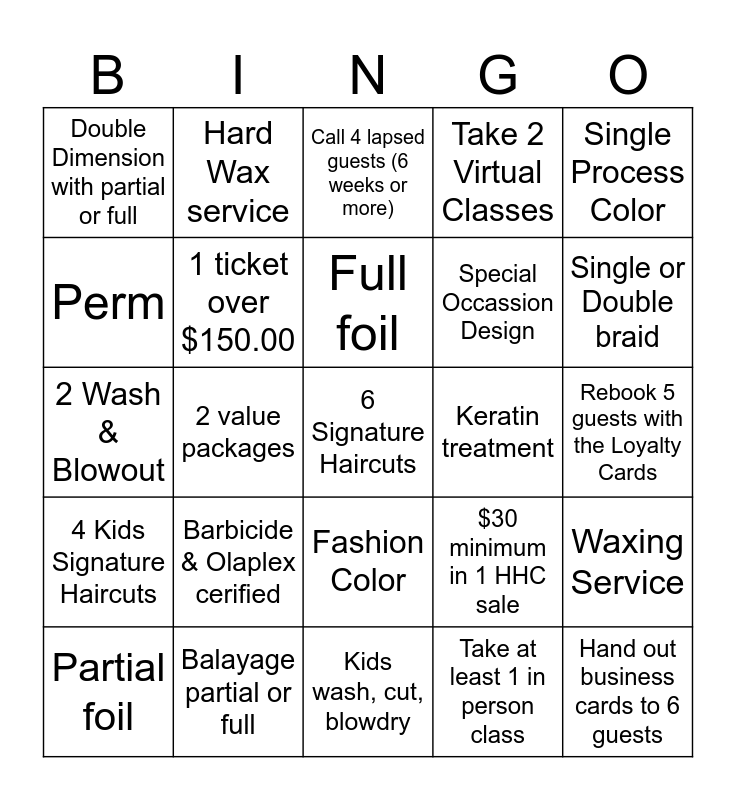 This bingo card has 25 words: Barbicide & Olaplex cerified, Kids wash, cut, blowdry, Full foil, Partial foil, Single Process Color, Double Dimension with partial or full, Perm, Hard Wax service, Keratin treatment, Fashion Color, Special Occassion Design, 2 Wash & Blowout, $30 minimum in 1 HHC sale, Waxing Service, 1 ticket over $150.00, Hand out business cards to 6 guests, Rebook 5 guests with the Loyalty Cards, Call 4 lapsed guests (6 weeks or more), Single or Double braid, 2 value packages, 6 Signature Haircuts, Balayage partial or full, 4 Kids Signature Haircuts, Take 2 Virtual Classes and Take at least 1 in person class.