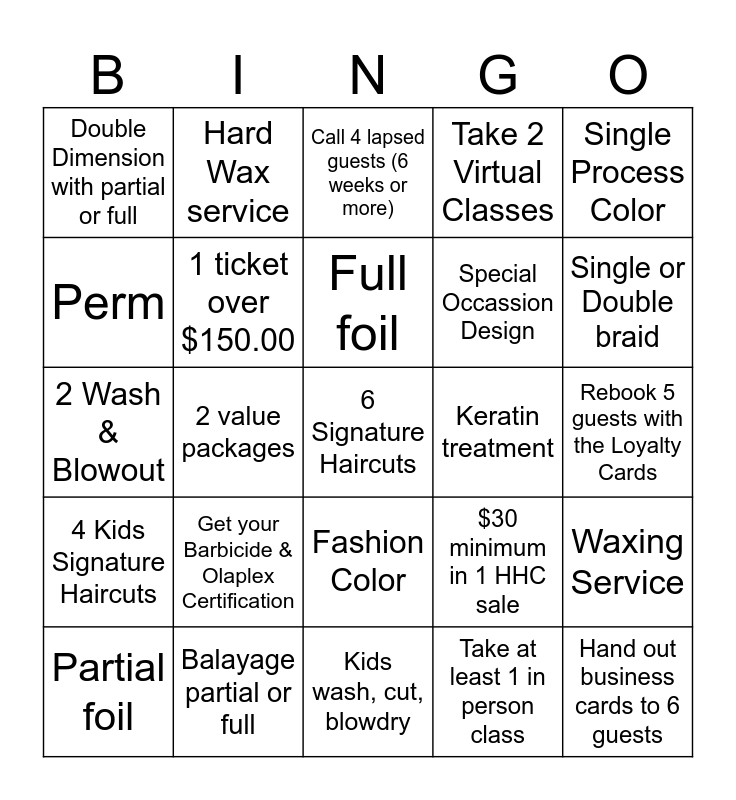 This bingo card has 25 words: Get your Barbicide & Olaplex Certification, Kids wash, cut, blowdry, Full foil, Partial foil, Single Process Color, Double Dimension with partial or full, Perm, Hard Wax service, Keratin treatment, Fashion Color, Special Occassion Design, 2 Wash & Blowout, $30 minimum in 1 HHC sale, Waxing Service, 1 ticket over $150.00, Hand out business cards to 6 guests, Rebook 5 guests with the Loyalty Cards, Call 4 lapsed guests (6 weeks or more), Single or Double braid, 2 value packages, 6 Signature Haircuts, Balayage partial or full, 4 Kids Signature Haircuts, Take 2 Virtual Classes and Take at least 1 in person class.