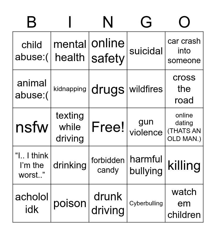 This bingo card has a free space and 24 words: drinking, poison, drugs, acholol idk, car crash into someone, child abuse:(, animal abuse:(, mental health, gun violence, forbidden candy, wildfires, nsfw, harmful bullying, killing, kidnapping, Cyberbulling, online dating (THATS AN OLD MAN.), online safety, cross the road, texting while driving, watch em children, “I.. I think I’m the worst..”, suicidal and drunk driving.