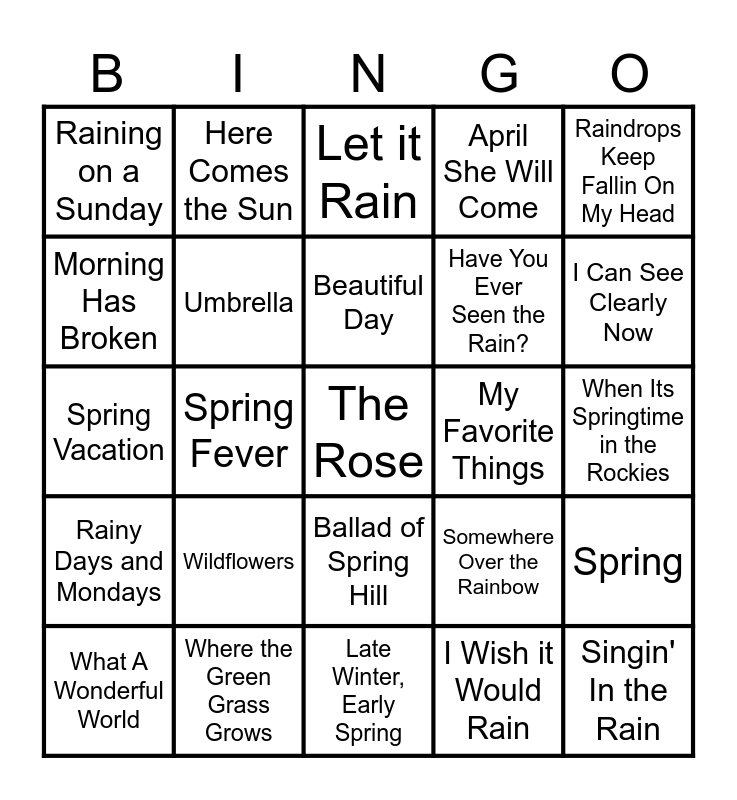 This bingo card has a free space and 24 words: Wildflowers, Where the Green Grass Grows, Beautiful Day, What A Wonderful World, Raindrops Keep Fallin On My Head, Raining on a Sunday, Morning Has Broken, Here Comes the Sun, My Favorite Things, Ballad of Spring Hill, Have You Ever Seen the Rain?, Spring Vacation, Somewhere Over the Rainbow, Spring, Umbrella, I Wish it Would Rain, When Its Springtime in the Rockies, Let it Rain, I Can See Clearly Now, Spring Fever, Singin' In the Rain, Rainy Days and Mondays, April She Will Come and Late Winter, Early Spring.