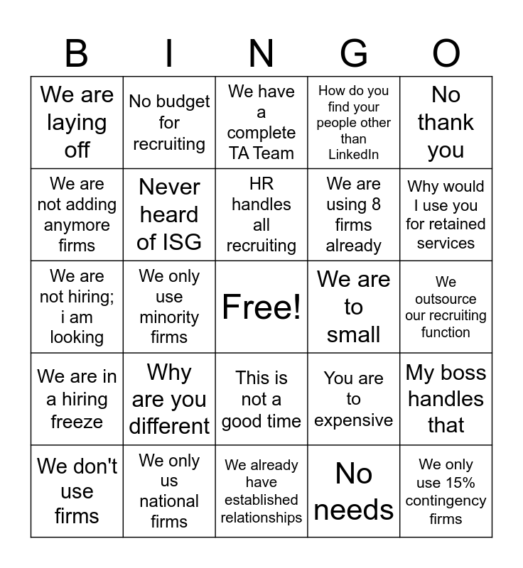 This bingo card has a free space and 24 words: We don't use firms, Why are you different, HR handles all recruiting, No needs, No thank you, We are laying off, No budget for recruiting, We have a complete TA Team, We are to small, We outsource our recruiting function, We are not hiring; i am looking, Never heard of ISG, You are to expensive, My boss handles that, We are not adding anymore firms, We only us national firms, We already have established relationships, How do you find your people other than LinkedIn, Why would I use you for retained services, We are in a hiring freeze, We only use minority firms, This is not a good time, We are using 8 firms already and We only use 15% contingency firms.