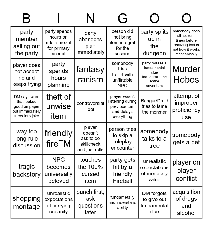 This bingo card has 36 words: party gets hit by a friendly Fireball, touches the 100% cursed item, fundametally miunnderstand ability, player does not accept no and keeps trying, way too long rule discussion, player wasn't listening during previous turn and delays everything, party spends hours planning, punch first, ask questions later, party splits up in the dungeon, unrealistic expectations of monetary value, Murder Hobos, person did not bring item integral for the session, player on player conflict, theft of unwise item, somebody tries to flirt with unflirtable NPC, party member selling out the party, tragic backstory, Ranger/Druid tries to tame the monster, DM says word that looked good on paper but immediately turns into joke, party abandons plan immediately, controversial loot, friendly fireTM, person tries to skip a roleplay encounter, player doesn't ask to do skillcheck and just rolls, somebody talks to a tree, party spends hours on riddle meant for primary school, party misses a fundamental clue that derails the entire adventure, unrealistic expectations of carrying capacity, fantasy racism, somebody does sth several times before realizing that is not how it works mechanically, acquisition of drugs and alcohol, shopping montage, somebody gets a pet, attempt of improper proficiency use, NPC becomes universally beloved and DM forgets to give out fundamental clue.