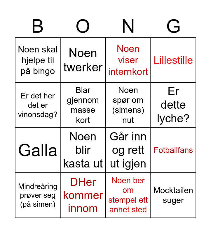 This bingo card has 16 words: DHer kommer innom, Fotballfans, Noen viser internkort, Noen skal hjelpe til på bingo, Galla, Noen twerker, Går inn og rett ut igjen, Noen ber om stempel ett annet sted, Er det her det er vinonsdag?, Blar gjennom masse kort, Mindreåring prøver seg (på simen), Lillestille, Noen blir kasta ut, Er dette lyche?, Noen spør om (simens) nut and Mocktailen suger.