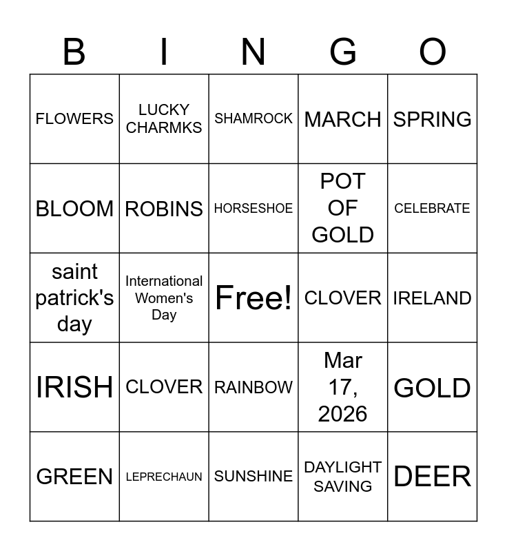This bingo card has a free space and 24 words: CLOVER, LEPRECHAUN, HORSESHOE, GREEN, SPRING, FLOWERS, BLOOM, LUCKY CHARMKS, CLOVER, RAINBOW, POT OF GOLD, saint patrick's day, Mar 17, 2026, GOLD, ROBINS, DAYLIGHT SAVING, IRELAND, SHAMROCK, CELEBRATE, International Women's Day, DEER, IRISH, MARCH and SUNSHINE.