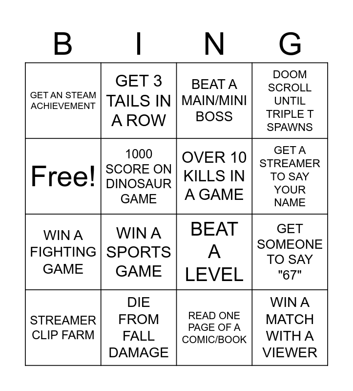 This bingo card has 16 words: DIE FROM FALL DAMAGE, GET SOMEONE TO SAY "67", BEAT A MAIN/MINI BOSS, GET AN STEAM ACHIEVEMENT, WIN A FIGHTING GAME, GET 3 TAILS IN A ROW, BEAT A LEVEL, READ ONE PAGE OF A COMIC/BOOK, Free!, 1000 SCORE ON DINOSAUR GAME, STREAMER CLIP FARM, DOOM SCROLL UNTIL TRIPLE T SPAWNS, WIN A SPORTS GAME, GET A STREAMER TO SAY YOUR NAME, OVER 10 KILLS IN A GAME and WIN A MATCH WITH A VIEWER.