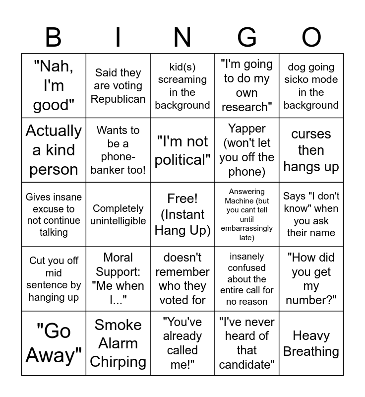 This bingo card has a free space and 24 words: Moral Support: "Me when I...", Smoke Alarm Chirping, "I'm not political", "Go Away", dog going sicko mode in the background, "Nah, I'm good", Actually a kind person, Said they are voting Republican, Answering Machine (but you cant tell until embarrassingly late), doesn't remember who they voted for, Yapper (won't let you off the phone), Gives insane excuse to not continue talking, insanely confused about the entire call for no reason, "How did you get my number?", Wants to be a phone-banker too!, "I've never heard of that candidate", Says "I don't know" when you ask their name, kid(s) screaming in the background, curses then hangs up, Completely unintelligible, Heavy Breathing, Cut you off mid sentence by hanging up, "I'm going to do my own research" and "You've already called me!".