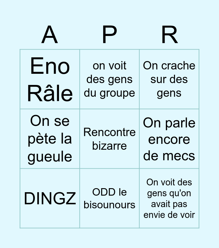 This bingo card has a free space and 8 words: On parle encore de mecs, On crache sur des gens, on voit des gens du groupe, DINGZ, Eno Râle, On voit des gens qu'on avait pas envie de voir, On se pète la gueule and ODD le bisounours.
