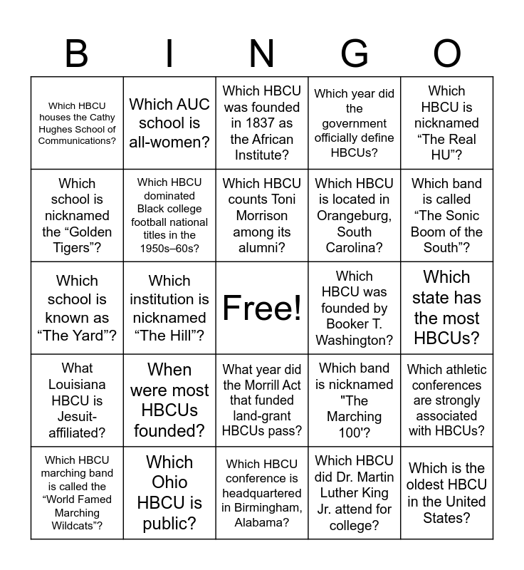 This bingo card has a free space and 24 words: When were most HBCUs founded?, Which Ohio HBCU is public?, Which HBCU counts Toni Morrison among its alumni?, Which HBCU marching band is called the “World Famed Marching Wildcats”?, Which HBCU is nicknamed “The Real HU”?, Which HBCU houses the Cathy Hughes School of Communications?, Which school is nicknamed the “Golden Tigers”?, Which AUC school is all-women?, Which HBCU was founded by Booker T. Washington?, What year did the Morrill Act that funded land-grant HBCUs pass?, Which HBCU is located in Orangeburg, South Carolina?, Which school is known as “The Yard”?, Which band is nicknamed "The Marching 100'?, Which athletic conferences are strongly associated with HBCUs?, Which HBCU dominated Black college football national titles in the 1950s–60s?, Which HBCU did Dr. Martin Luther King Jr. attend for college?, Which state has the most HBCUs?, Which HBCU was founded in 1837 as the African Institute?, Which band is called “The Sonic Boom of the South”?, Which institution is nicknamed “The Hill”?, Which is the oldest HBCU in the United States?, What Louisiana HBCU is Jesuit-affiliated?, Which year did the government officially define HBCUs? and Which HBCU conference is headquartered in Birmingham, Alabama?.
