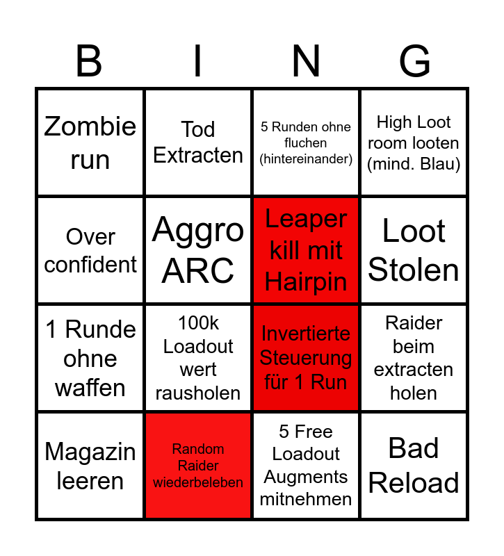 This bingo card has 25 words: Random Raider belebt Maiki, Startturm Jump, Invertierte Steuerung für 1 Run, Be A RAT, Zombie run, Tod Extracten, 5 Runden ohne fluchen (hintereinander), High Loot room looten (mind. Blau), 1 Runde ohne waffen, 100k Loadout wert rausholen, 5 Free Loadout Augments mitnehmen, Raider beim extracten holen, Raider zum Singen bringen, Random Raider wiederbeleben, Leaper kill mit Hairpin, 10 Arcs ohne Heal töten, Magazin leeren, Aggro ARC, Loot Death, Bad Reload, Over confident, 1HP Lie, Out of ammo, Loot Stolen and Retreat.