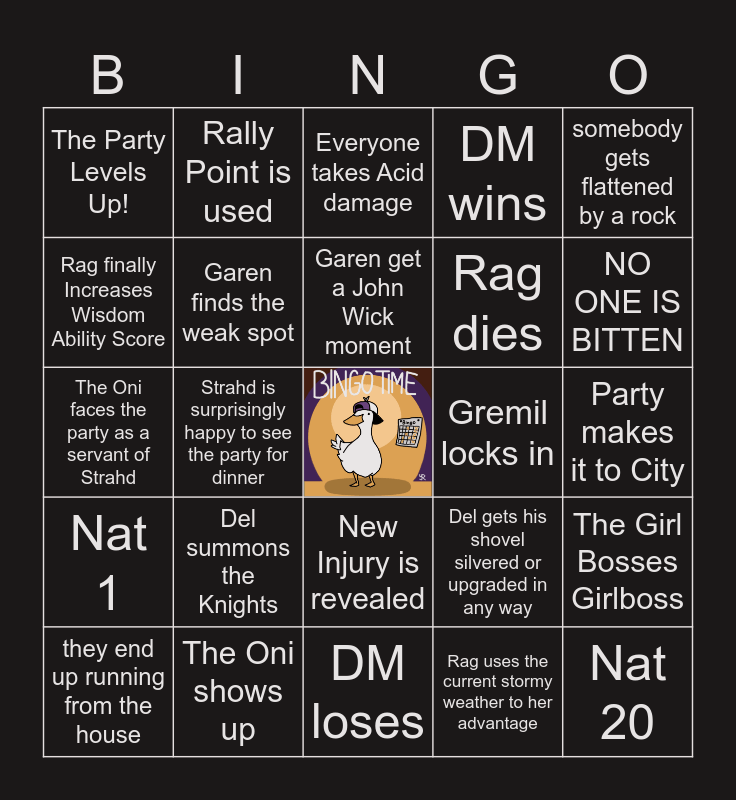 This bingo card has a free space and 24 words: Del summons the Knights, The Oni shows up, Garen get a John Wick moment, they end up running from the house, somebody gets flattened by a rock, The Party Levels Up!, Rag finally Increases Wisdom Ability Score, Rally Point is used, Gremil locks in, New Injury is revealed, Rag dies, The Oni faces the party as a servant of Strahd, Del gets his shovel silvered or upgraded in any way, The Girl Bosses Girlboss, Garen finds the weak spot, Rag uses the current stormy weather to her advantage, Party makes it to City, Everyone takes Acid damage, NO ONE IS BITTEN, Strahd is surprisingly happy to see the party for dinner, Nat 20, Nat 1, DM wins and DM loses.