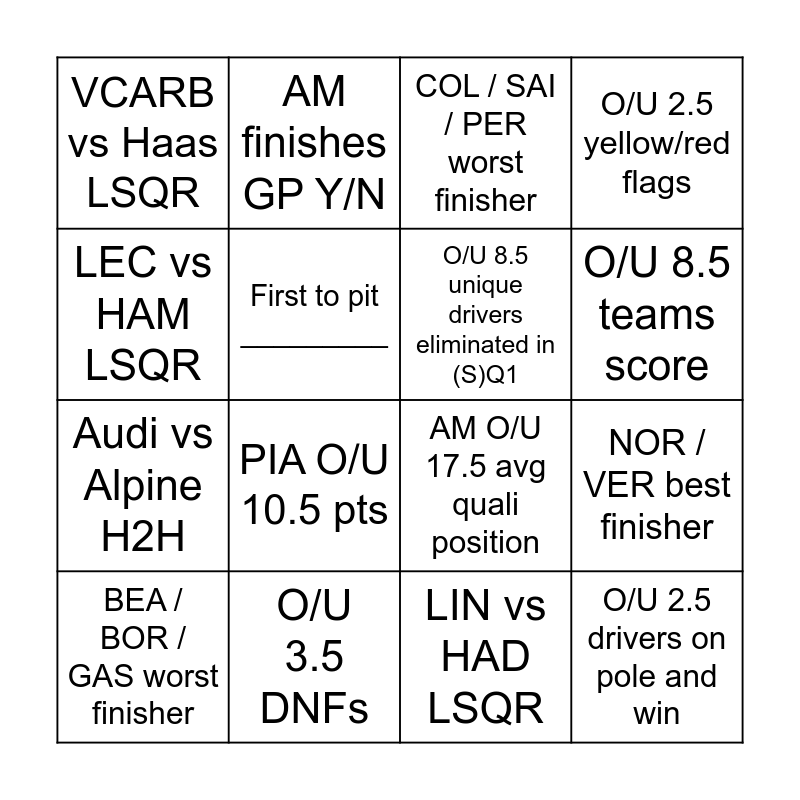 This bingo card has 16 words: O/U 3.5 DNFs, NOR / VER best finisher, COL / SAI / PER worst finisher, VCARB vs Haas LSQR, Audi vs Alpine H2H, AM finishes GP Y/N, AM O/U 17.5 avg quali position, LIN vs HAD LSQR, LEC vs HAM LSQR, First to pit _________, BEA / BOR / GAS worst finisher, O/U 2.5 yellow/red flags, PIA O/U 10.5 pts, O/U 8.5 teams score, O/U 8.5 unique drivers eliminated in (S)Q1 and O/U 2.5 drivers on pole and win.