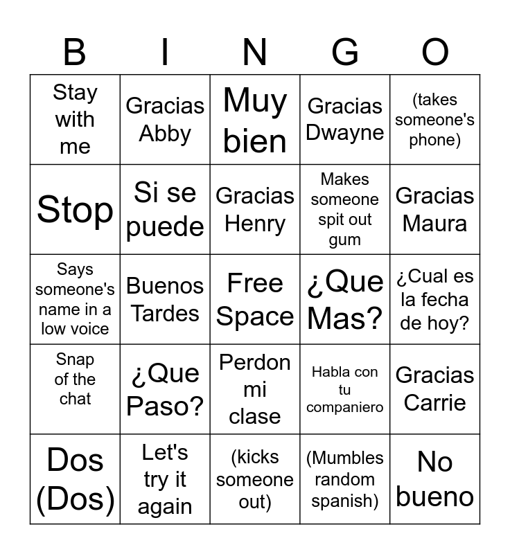 This bingo card has a free space and 29 words: Dos (Dos), Levantan la mano, Buenos Tardes, Lock in, Stay with me, Muy bien, Si se puede, ¿Que Paso?, ¿Que Mas?, Let's try it again, ¿Cual es la fecha de hoy?, No bueno, (kicks someone out), (Mumbles random spanish), Gracias Maura, Nope not having it, Perdon mi clase, Snap of the chat, (takes someone's phone), Says someone's name in a low voice, Habla con tu companiero, Levantanse /sientense, Makes someone spit out gum, Stop, Gracias Dwayne, Gracias Abby, Gracias Carrie, Gracias Henry and Gracias Ben.