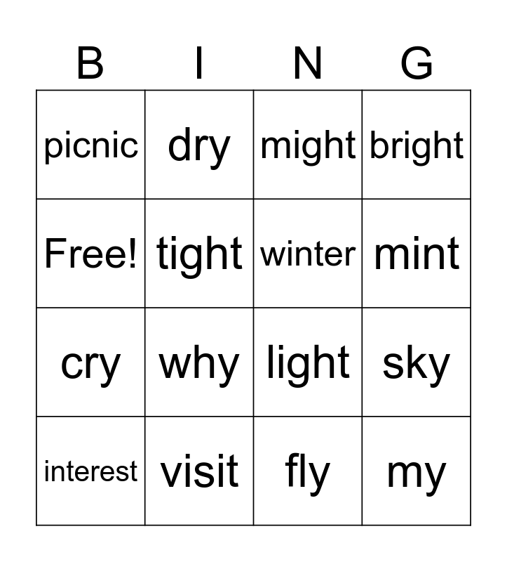 This bingo card has 16 words: visit, sky, might, picnic, cry, dry, light, fly, Free!, tight, interest, bright, why, mint, winter and my.