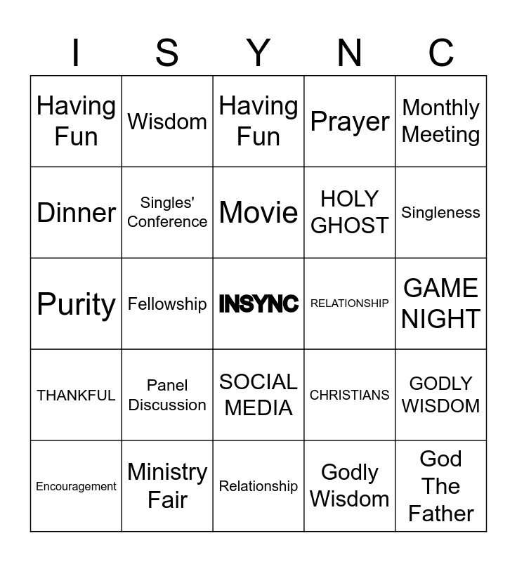 ⚠ This card has duplicate items: Jesus Christ (2), Relationship (2), Having Fun (2), Social Media (2), Commitment (2), Cell Phone (2), Purity (2), Holy Spirit (2)