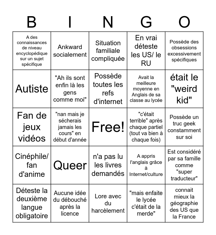 This bingo card has a free space and 24 words: Queer, Aucune idée du débouché après la licence, Possède toutes les refs d'internet, Déteste la deuxième langue obligatoire, Possède des obsessions excessivement spécifiques, A des connaissances de niveau encyclopédique sur un sujet spécifique, Autiste, Ankward socialement, "c'était terrible" après chaque partiel (tout va bien à chaque fois), n'a pas lu les livres demandés, Avait la meilleure moyenne en Anglais de sa classe au lycée, Fan de jeux vidéos, A appris l'anglais grâce à Internet/culture, Est considéré par sa famille comme "super traducteur", "Ah ils sont enfin là les gens comme moi", "mais enfaite le lycée c'était de la merde", Possède un truc geek constamment sur soi, Situation familiale compliquée, était le "weird kid", "nan mais je sécherais jamais les cours" en début d'année, connait mieux la géographie des US que la France, Cinéphile/ fan d'anime, En vrai déteste les US/ le RU and Lore avec du harcèlement.