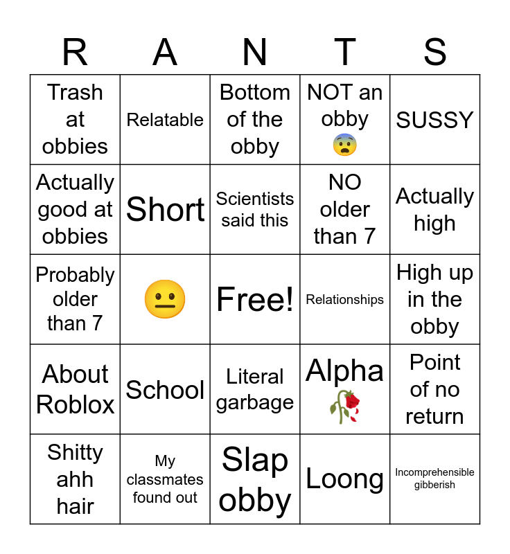 This bingo card has a free space and 24 words: School, My classmates found out, Scientists said this, Shitty ahh hair, SUSSY, Trash at obbies, Actually good at obbies, Relatable, Relationships, Literal garbage, NO older than 7, Probably older than 7, Alpha 🥀, Point of no return, Short, Loong, High up in the obby, Bottom of the obby, Actually high, 😐, Incomprehensible gibberish, About Roblox, NOT an obby 😨 and Slap obby.