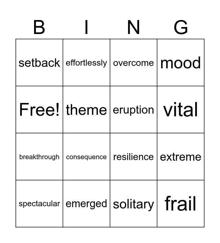 This bingo card has 16 words: emerged, extreme, overcome, setback, breakthrough, effortlessly, resilience, solitary, Free!, theme, spectacular, mood, consequence, vital, eruption and frail.